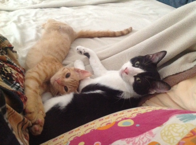 E o pasiune, cred, da… Pur şi simplu nu pot să întâlnesc un animal care e clar neputincios – un pisoi mic pe o stradă circulată intens de maşini, de exemplu – şi să trec fără să fac nimic. Nu ştiu, mie nu mi se pare normal. Uite, pe Benjamin, care e la voi acasă, l-am găsit întâmplător pe strada Speranţei, stătea în mijlocul străzii. Cum era să îl las acolo? Priveşte şi treci n-a fost niciodată printre principiile mele şi încerc şi împart acelaşi cer cu un om care simte la fel. Adică un bărbat care nu ar fi alături de mine în povestea asta… nu are ce să caute lângă mine, eu nu mă pot opri din salvat animale, e un fel de menire, dacă vrei. Sigur, nu pot salva lumea, dar pot salva ce se întâmplă pe strada mea şi în drumul meu. Partea bună e, însă, nu doar aceea că Răzvan îmi înţelege nebunia, dar participă la ea :)) Niciodată, dar niciodată nu mi-a zis: aoleu, încă unul? păi, ce-o să ne facem? păi, cum ne descurcăm? Nu m-a bătut niciodată la cap. Uite, vara trecută am ieşit un sfert de ceas să mă plimb cu bicicleta, iar pe strada Salcâmilor am găsit un motanel portocaliu lovit de maşină. L-am luat în braţe şi până acasă l-am botezat Mango. Când ne-a văzut Răz, care mă aştepta pe balcon, îmi amintesc perfect cum mi-a zis: oh, el cine e? Mango, zic. Bine ai venit, Mango, i-a spus el. M-am simţit binecuvântată în clipa aceea. Mă rog, cu Mango a fost poveste lungă, operaţie, drumuri la vet, infecţie, alte drumuri la vet, pampers, o nebunie. Să ne fi vazut dimineaţa la cinci, zile la rând, schimbând de urgenţă pamperşi, adormiţi amândoi, el ţinându-l pe motănel, eu mânuind scutecul! Cred că eram tare simpatici, îmi amintesc cu drag şi perioada aceea. Am scos-o la capăt, cu iubire şi răbdare, cu el cred că a fost cel mai dificil, dar acum Mango e fericit alături de Boeing Boeing, o altă pisicuţă salvată în sezonul primavară-vară 2013.