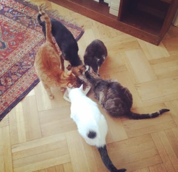 Probabil că explicaţia vine din felul în care am crescut eu, într-o familie mare iubitoare de animale. La noi acasă erau mereu animale luate de pe stradă, fie le aduceam eu, fie le găseau părinţii mei. Ţin minte că, odată, ne-am întors de la mare cu o pisicuţă, o găsisem pe drum şi ai mei nu s-au îndurat s-o lase acolo, eu eram foarte mică. Nu faptul că eu plângeam că era singură acolo, ci o dragoste sinceră faţă de animale în general i-a îndemnat pe ei să facă acel gest, adeseori repetat în copilăria mea. Aşadar eu asta am văzut în jur, am învăţat că e bine aşa, să întindem o mână de ajutor atunci când e nevoie. Nu mi s-a întâmplat să aduc acasă vreun animal, iar mama să mă certe, dimpotrivă: spunea hai, să-i dau nişte lapte, hai, să-i facem un culcuş. Iar despre tata, cea mai pregnantă amintire e aceea în care el a stat până dimineaţă lângă unul dintre motanii noştri, foarte bolnav, şi l-a mângăiat şi i-a vorbit până a murit. Şi tristeţea lui din zilele ce au urmat, nu voi uita niciodată acel final de poveste. Prin urmare, eu nu puteam să devin altfel şi între timp l-am luat şi pe Răzvan în barca asta luminoasă 🙂 Când ne-am cunoscut noi, respectiv când ne-am mutat împreună, imediat după aceea, eu aveam două pisici. Între timp am ajuns la trei motani – Tristi, Vrăjitorul din Berlioz şi Oscar Leon Portocală, o pisică – Coco, şi Lola, căţeluşa noastră. Toţi luaţi de pe stradă. Aceştia sunt cei de care nu ne-am mai putut despărţi, că pe la noi au trecut în ultimii aproape trei ani vreo douăzeci de suflete, căţei şi pisici. De toţi ne-am ataşat, pe toţi ni-i amintim cu drag, dar golanii de mai sus au rămas 🙂