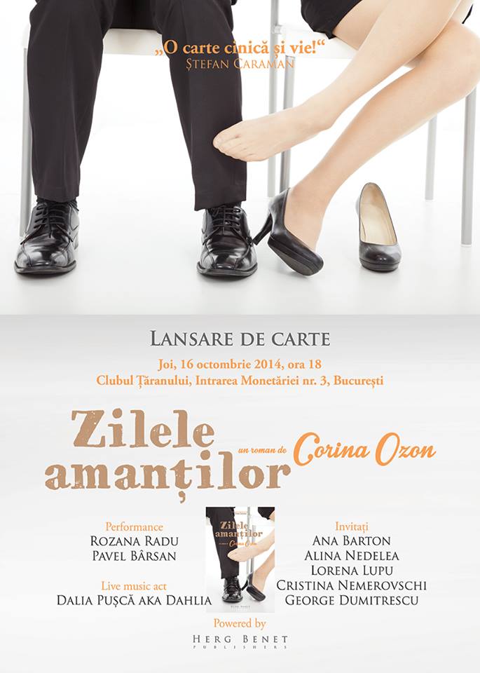 Iată că a venit momentul să anunţ cel mai plăcut lucru, după apariţia cărţii: lansarea. Va fi o seară inedită, găzduită de Clubul Ţăranului Român, pe 16 octombrie, de la ora 18. Voi fi însoţită de artileria grea a femeilor scriitoare din noul val: Ana Barton, Cristina Nemerovschi, Alina Nedelea, Lorena Lupu. Printre invitaţi se va afla şi George Dumitrescu, fost coleg la Antena 1 de pe vremuri, care a acceptat spre bucuria mea să fie alături de mine la acest eveniment. La fel şi frumoasa Dalia Puşcă, şi cu ea am lucrat la Antena 1, care va cânta cele mai noi piese ale sale. Le mulţumesc din suflet că îşi fac timp să vină pentru mine.